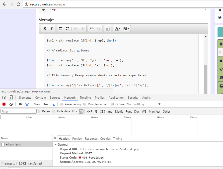 claro esto ya lo eh visto antes, si intentas subir por ejemplo un iframe tampoco te lo permite, esto es por que el servidor esta bloqueando la publicación de códigos ya que es algo "delicado"